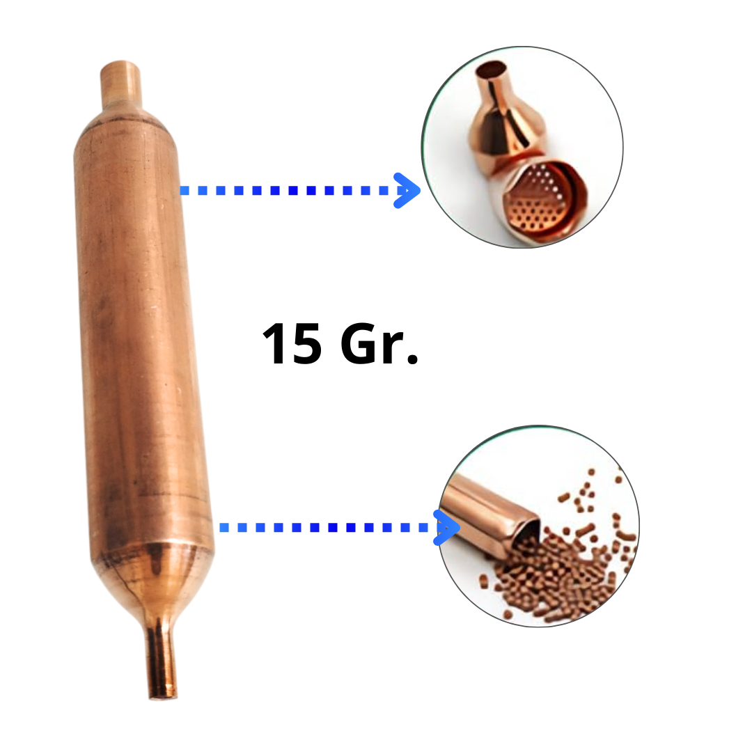 Este filtro molecular de 15 gramos sin chicote es una solución confiable y eficiente para mantener la pureza en sistemas de refrigeración y aire acondicionado. Fabricado en cobre de alta calidad, está diseñado para absorber la humedad y atrapar impurezas, protegiendo el compresor y prolongando la vida útil del sistema.